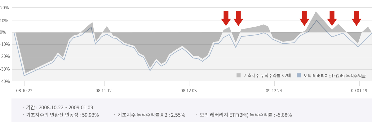 2. 기초지수의 일정기간 누적수익률이 플러스(+)이거나 0%(제로)에 가까움에도 불구하고 동기간 KODEX 레버리지의 수익률은 마이너스(-)를 기록할 수 있습니다.