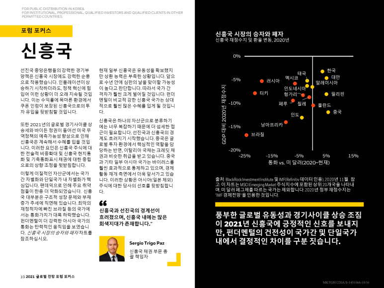 이렇게이질적인자산군에서는국가간 차별화와단일국가내 차별화가핵심입니다. 팬데믹으로인해 주요 취약점들이한층 더 악화되었습니다. 신흥국 대부분은구조적 성장문제와 부채증가 추세에직면해 있습니다. 최악의재정적자에빠진 브라질 등의국가에서는 통화가치가대폭 하락했습니다. 펀더멘털이더 강력한아시아국가의통화는탄력적인움직임을보였습니다. 신흥국 시장의승자와패자 차트를참조하십시오.