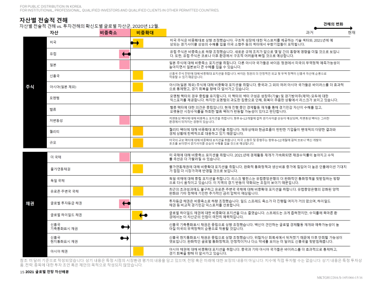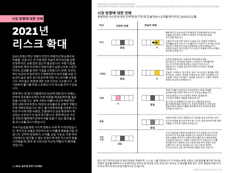 2021년에는백신 개발의진전이 위험자산에순풍으로작용할 것입니다. 주식에대한 전술적투자의견을상향조정하지만, 균형 잡힌 접근이필요합니다. 우량 기업을선호하며, 특히 미국에서재정지원이실망스러운수준이더라도성과를 낼 만한 기업을선호합니다. 한편, 대규모백신 보급의타임라인이구체화되면서호조세를보일 가능성이높은 일부 경기민감주에대한 익스포저를선호합니다. 하이일드채권에대한 선호 의견도고수합니다. 경기회복이활기를띠면 스프레드가더 축소될여지가있습니다.