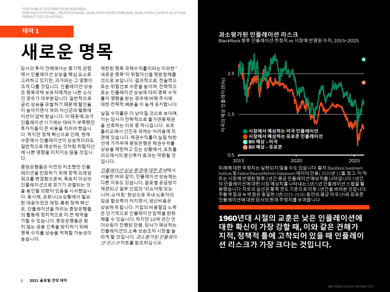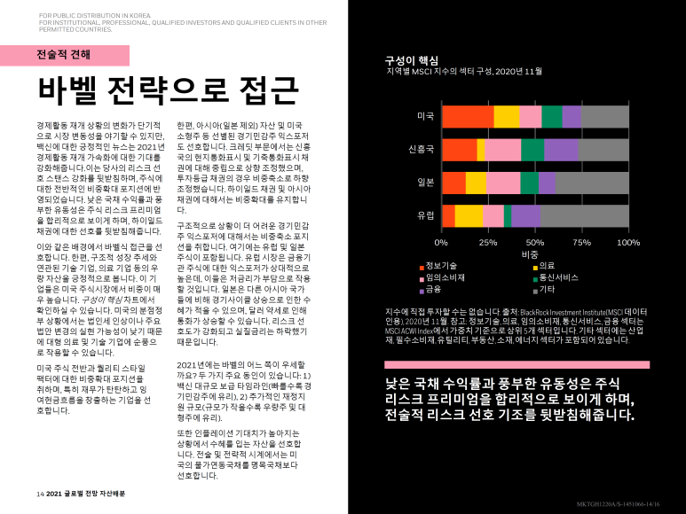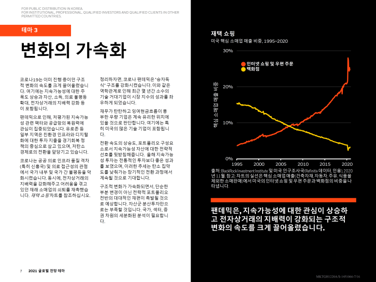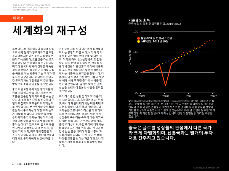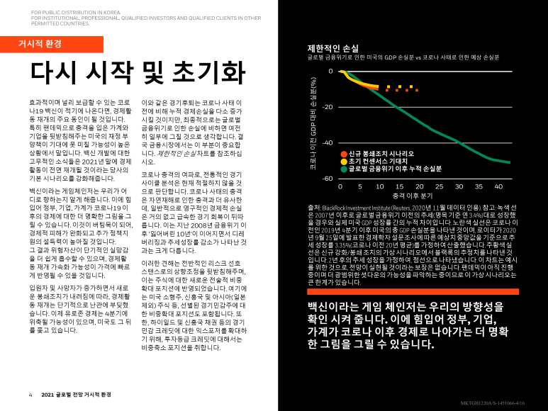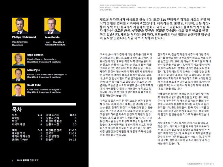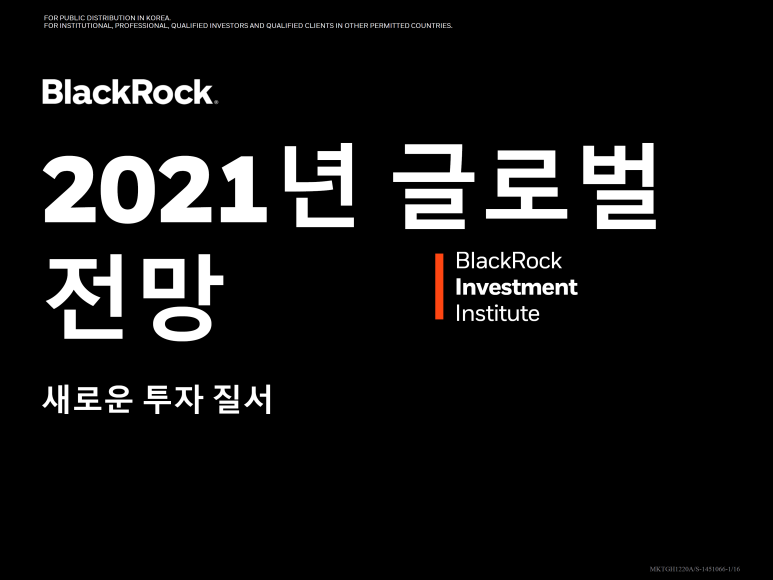 식의 중대한 변화를 가속화하고 있습니다. 지속가능성, 불평등, 지정학, 공동 재정-통화 정책 혁신 등 4가지 차원에서 변화가 나타나고 있습니다. 블랙록의 새로운 투자 테마인새로운명목, 세계화의재구성, 변화의가속화는 이와 같은 변화를 반영하고 있습니다. 새로운 투자질서에 따라, 포트폴리오 자산 배분은 근본적인 재구성이 필요할 것입니다. 지금 바로 시작해야 합니다.