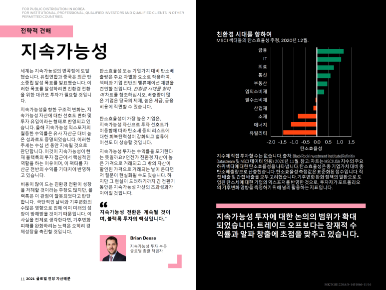 지속가능성을향한 구조적변화는, 지속가능성자산에대한 선호도변화 및투자 유입이라는형태로 반영되고있습니다. 올해 지속가능성익스포저의월등한수익률은유사 자산군대비 높은 성과로도증명되었습니다. 이러한추세는수십 년 동안지속될 것으로판단합니다. 이것이 지속가능성이현재 블랙록의투자 접근에서핵심적인역할을하는 이유이며, 이 팩터를 자산군 전반의수익률 기대치에반영하고 있습니다.