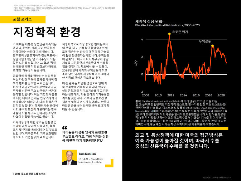 코로나19로인해 미국과중국을중심으로 세계 질서가양극화되고글로벌공급망이재편되는등의 지정학적변화가 가속화되며, 효율성을다소 포기하더라도더 큰 탄력성을추구합니다. 미국과중국의 전략적경쟁은계속될것으로보이며, 중국이기초기술자립을 목표로 하는 와중에기술 섹터가양분되는양상입니다. 미국에서는양국간 무역적자보다인권을 더 강조하는방향으로초점이이동할 수 있습니다.