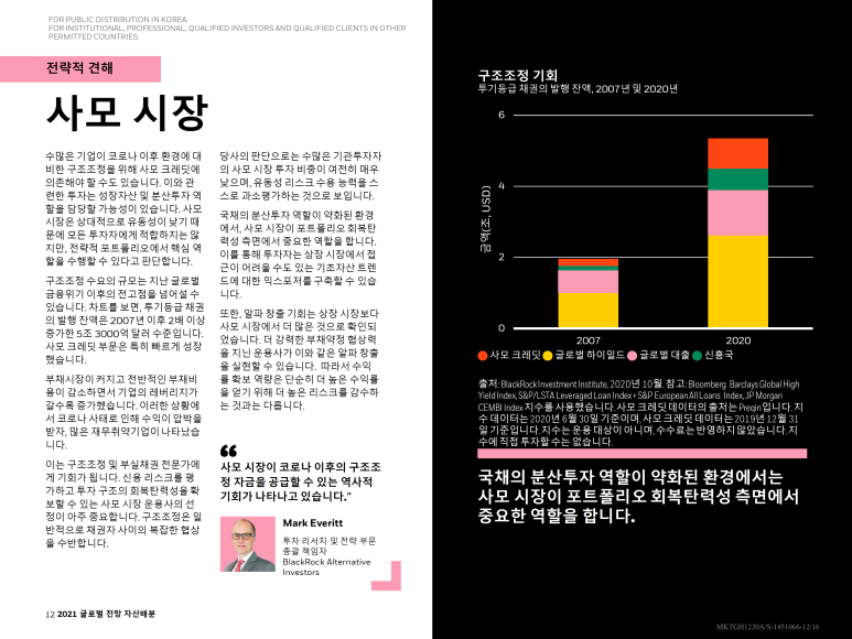 수많은기업이 코로나이후 환경에대비한 구조조정을위해 사모 크레딧에의존해야할 수도 있습니다. 이와 관련한 투자는성장자산및 분산투자역할을 담당할가능성이있습니다. 사모시장은상대적으로유동성이낮기때문에 모든 투자자에게적합하지는않지만, 전략적포트폴리오에서핵심 역할을 수행할수 있다고판단합니다.