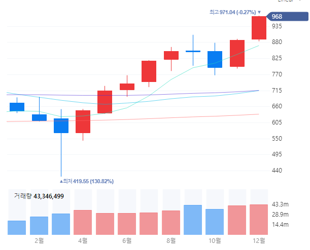 | 12월 | 889.53 | 971.04 | 883.24 | 968.42 | 43,346,507,000 |
