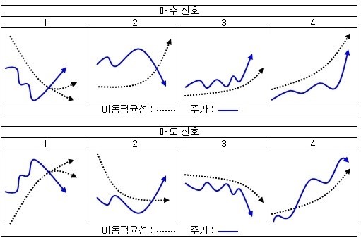 주가와 이동평균선간의 움직임으로 매수 매도 신호를 파악하는 방법이다.